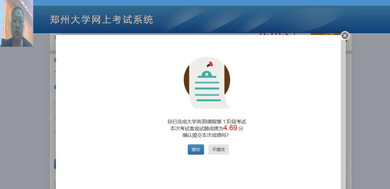 學(xué)生可根據(jù)分?jǐn)?shù)情況確認(rèn)是否提交本次成績(jī),如對(duì)本次考試成績(jī)不滿意,可以不提交本次考試,可對(duì)該課程本階段再次進(jìn)行考試,如提交成績(jī)?cè)撾A段將無法再次進(jìn)行考試,如下圖所示: