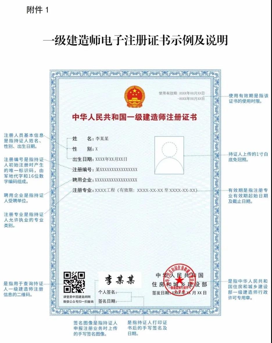 1.自2021年10月15日起,在全國范圍內(nèi)實行一級建造師電子證書(具體示例及說明見附件1),電子證書式樣按照《全國一體化在線政務(wù)服務(wù)平臺電子證照一級建造師注冊證書》標(biāo)準(zhǔn)執(zhí)行(具體式樣見附件2)。自2022年1月1日起,一級建造師統(tǒng)一使用電子證書,紙質(zhì)注冊證書作廢。