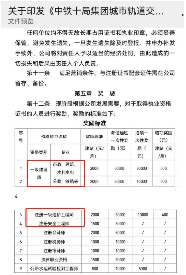 最近中鐵十局針對(duì)取得執(zhí)業(yè)資格證書(shū)的人員進(jìn)行獎(jiǎng)勵(lì),其中一級(jí)建造師、注冊(cè)一級(jí)造價(jià)工程師、注冊(cè)安全工程師均在獎(jiǎng)勵(lì)范圍內(nèi),獎(jiǎng)勵(lì)如下: