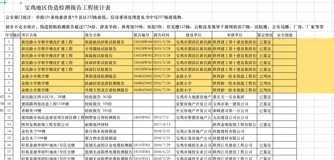 據記者掌握的相關材料,截至2020年1月,寶雞市公安局刑事偵查支隊已查實,存在犯罪事實(偽造印章出具假報告)的建筑有32棟,另有135棟建筑正在核查中。