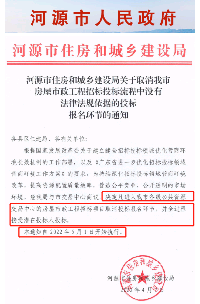 近日,河源市住建局發布了關于取消我市房屋市政工程招標投標流程中沒有法律法規依據的投標報名環節的通知。5月1日起執行。