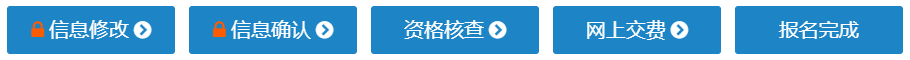當前報考狀態呈現如下圖,信息修改、信息確認、資格核查、網上交費、報名完成5個按鈕均呈現藍色背景狀態,且信息修改和信息確認已鎖定,有報名完成字樣等。