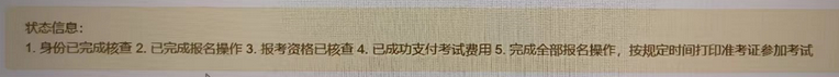 狀態信息需顯示:1.身份已完成核查;2.已完成報名操作;3.報考資格已核查;4.已成功支付考試費用;5.完成全部報名操作,按規定時間打印準考證參加考試。