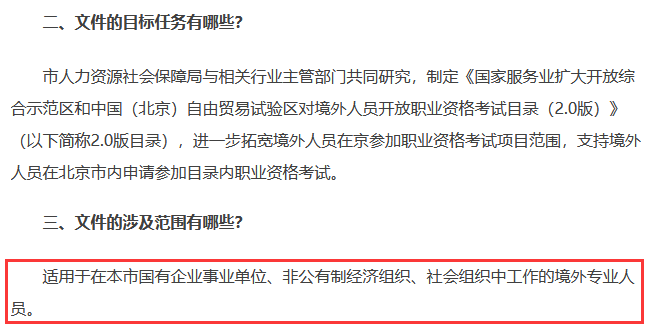 早在2021年4月,北京市人力資源和社會保障局就發(fā)布了《國家服務業(yè)擴大開放綜合示范區(qū)和中國(北京)自由貿易試驗區(qū)對境外人員開放職業(yè)資格考試目錄(1.0版)》,其中也提到了: