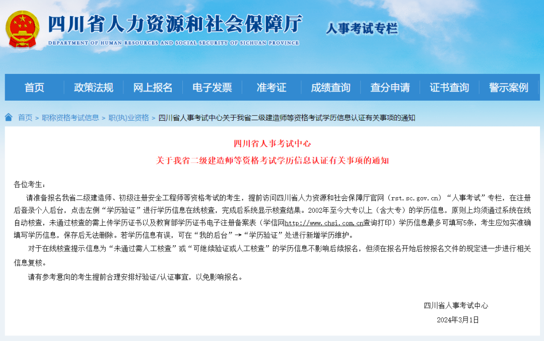 近日,四川人社廳發布《關于我省二級建造師等資格考試學歷信息認證有關事項的通知》:請準備報名我省二級建造師、初級注冊安全工程師等資格考試的考生,提前合理安排好驗證/認證學歷信息事宜,以免影響報名。