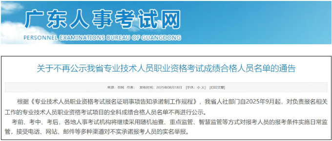 近日,廣東人事考試網(wǎng)發(fā)布《關(guān)于不再公示我省專業(yè)技術(shù)人員職業(yè)資格考試成績(jī)合格人員名單的通告》。