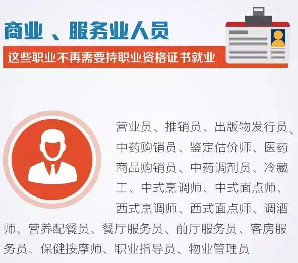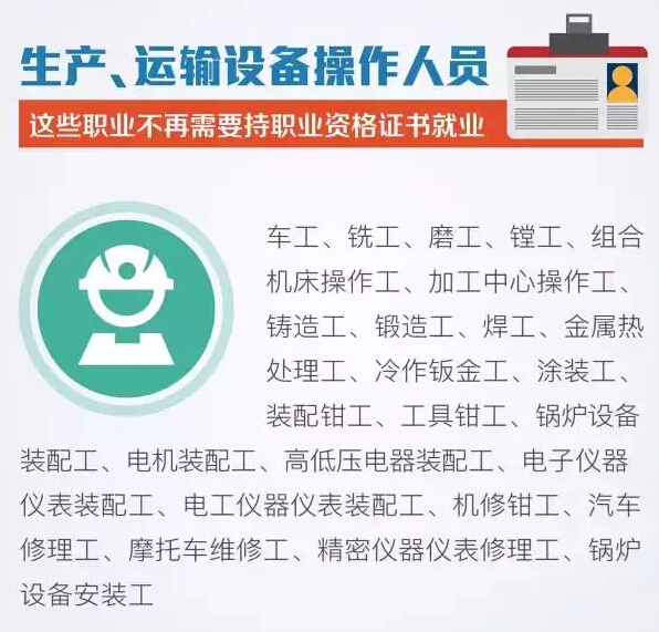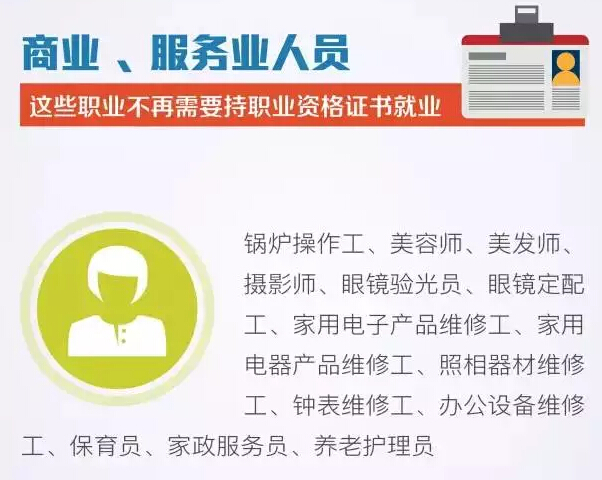 人社部決定對原勞動保障部《招用技術工種從業人員規定》(勞動保障部令第6號)予以廢止。6號令規定了90個持職業資格證書就業的職業,包括車工、汽車修理工、營業員、美容師、美發師、攝影師、家政服務員、秘書等。