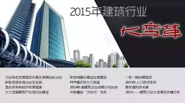 2014年是中國全面深化改革的元年,2015年是持續(xù)推進(jìn)年,釋放出中國發(fā)展的活力,注定要在歷史上留下濃重的一筆,建筑業(yè)又有哪些變化?這些變化已在發(fā)生或即將發(fā)生!你準(zhǔn)備好了嗎?