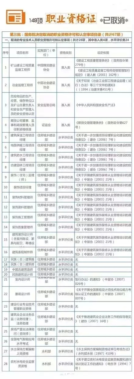 李克強總理在今年7月15日主持召開國務院常務會議。會議決定,在去年以來已取消149項職業資格的基礎上,再取消網絡廣告經紀人、注冊電子貿易師、全國外貿業務員、港口裝卸工等62項職業資格。還將繼續集中取消職業資格許可和認定事項。備考前要查清楚!