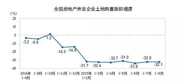 1-8月份,房地產(chǎn)開(kāi)發(fā)企業(yè)土地購(gòu)置面積14116萬(wàn)平方米,同比下降32.1%,降幅比1-7月份擴(kuò)大0.1個(gè)百分點(diǎn);土地成交價(jià)款4294億元,下降24.6%,降幅收窄1個(gè)百分點(diǎn)。