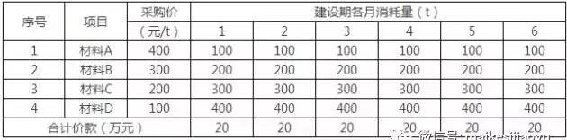 某項目的建設期6個月,合同約定進度款40萬元/月(不含稅價格)。施工中,甲施工單位共采購了4種建筑材料,材料價格(不含稅價格)及各月消耗量見下表。