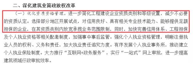 2017年2月24日,國務院辦公廳下發《關于促進建筑業持續健康發展的意見》(國辦發〔2017〕19號),將“優化資質資格管理”作為首要事項,放在文件“深化建筑業簡政放權改革”的第一條,足見重視程度。