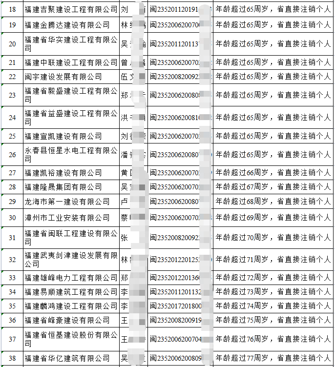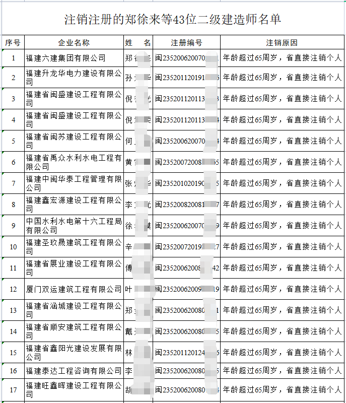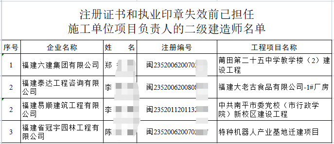福建省鄭某來、孫某華等43人因為年齡超過官方限制,二建注冊證書被集中注銷,所持有的注冊證書和執業印章失效前已經擔任施工單位項目負責人的,在其注冊證書和執業印章注銷后仍可執業至該項目竣工。