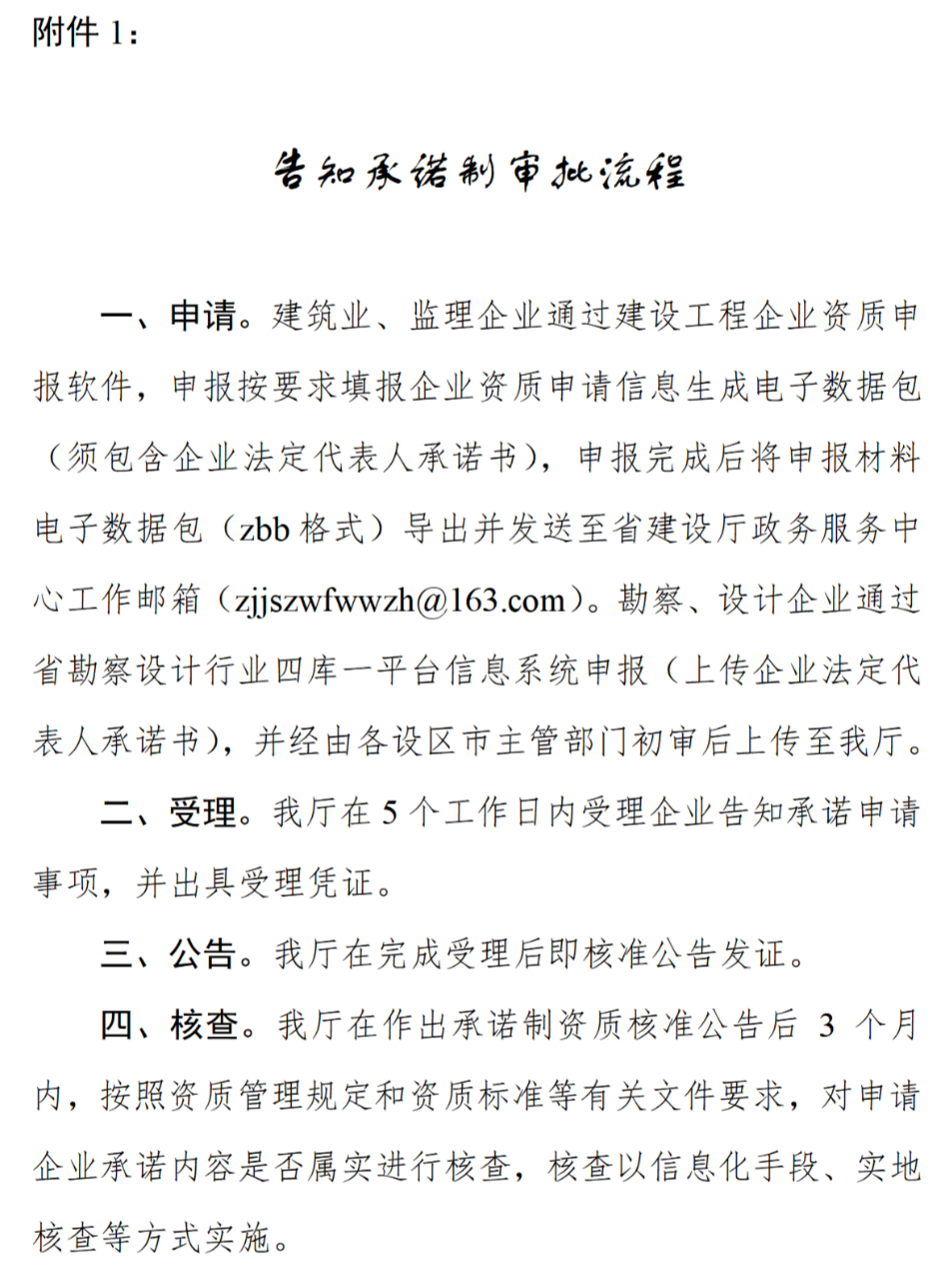 一、2022年8月1日起,住房城鄉建設部審批權限下放試點的工程勘察、設計、監理甲級資質和施工總承包、專業承包一級資質全面推行告知承諾制審批(重新核定事項除外)。申報相關要求參照《關于印發<浙江省深化住房城鄉建設領域“證照分離”改革全覆蓋試點工作實施方案>的通知》(浙建〔2020〕11號)執行,審批流程和企業法定代表人承諾書詳見附件1、2。