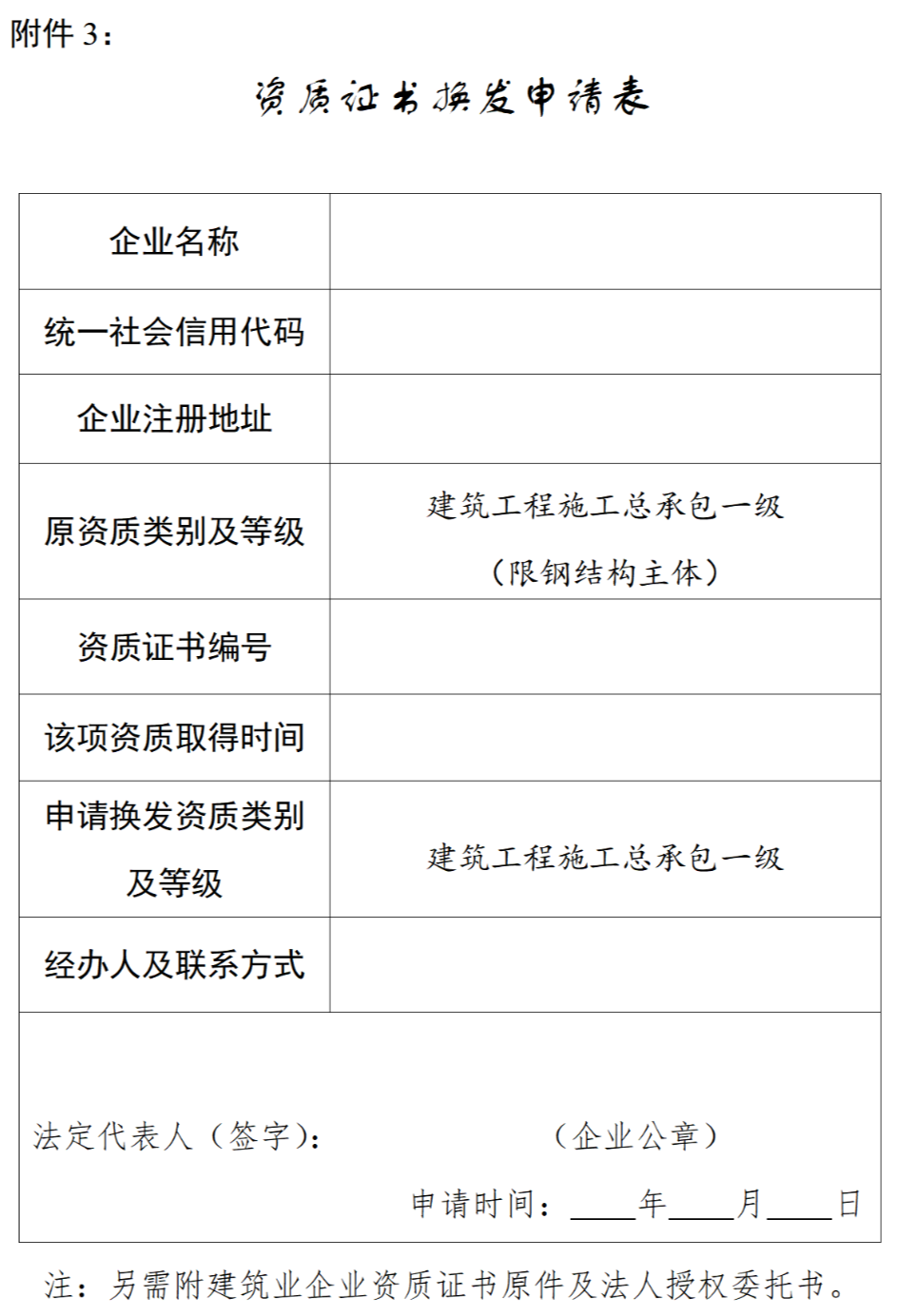 二、具有建筑工程施工總承包一級資質(限鋼結構主體工程)的建筑業企業,可提交《資質證書換發申請表》(見附件3),申請換發建筑工程施工總承包一級資質證書。