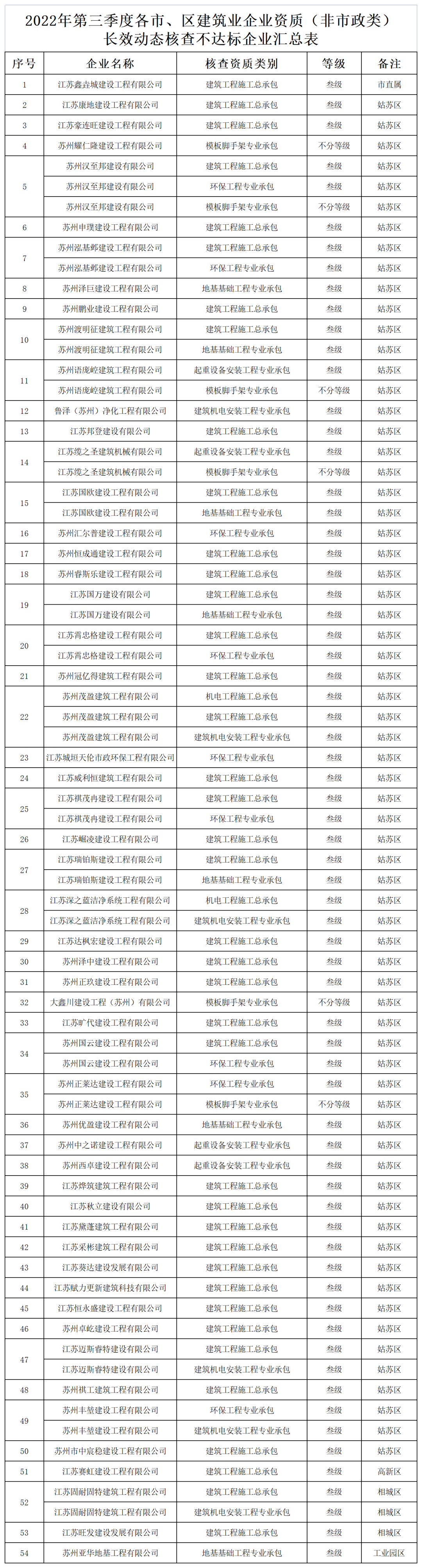 整改期間,上述54家企業(yè)(詳見附件3)不得以不達(dá)標(biāo)的建筑業(yè)資質(zhì)新承接工程項(xiàng)目、合同歸集、調(diào)整主管部門和申報(bào)資質(zhì)升級(jí)、增項(xiàng)、合并、重組、分立。同時(shí),根據(jù)市住建局《關(guān)于調(diào)整優(yōu)化建筑業(yè)企業(yè)信用綜合評(píng)價(jià)良好行為和不良行為計(jì)分標(biāo)準(zhǔn)的通知》(蘇住建建〔2022〕35號(hào)),核查不達(dá)標(biāo)企業(yè)被通報(bào)的每項(xiàng)不達(dá)標(biāo)資質(zhì)扣減0.5分,記入信用評(píng)價(jià)。市住建局將統(tǒng)一向社會(huì)公布2022年第三季度已整改完成的非市政類資質(zhì)建筑業(yè)企業(yè)名單。整改期滿仍未達(dá)到資質(zhì)標(biāo)準(zhǔn)的企業(yè)將由市住建局抄送資質(zhì)許可機(jī)關(guān),建議撤回相應(yīng)建筑業(yè)資質(zhì)。