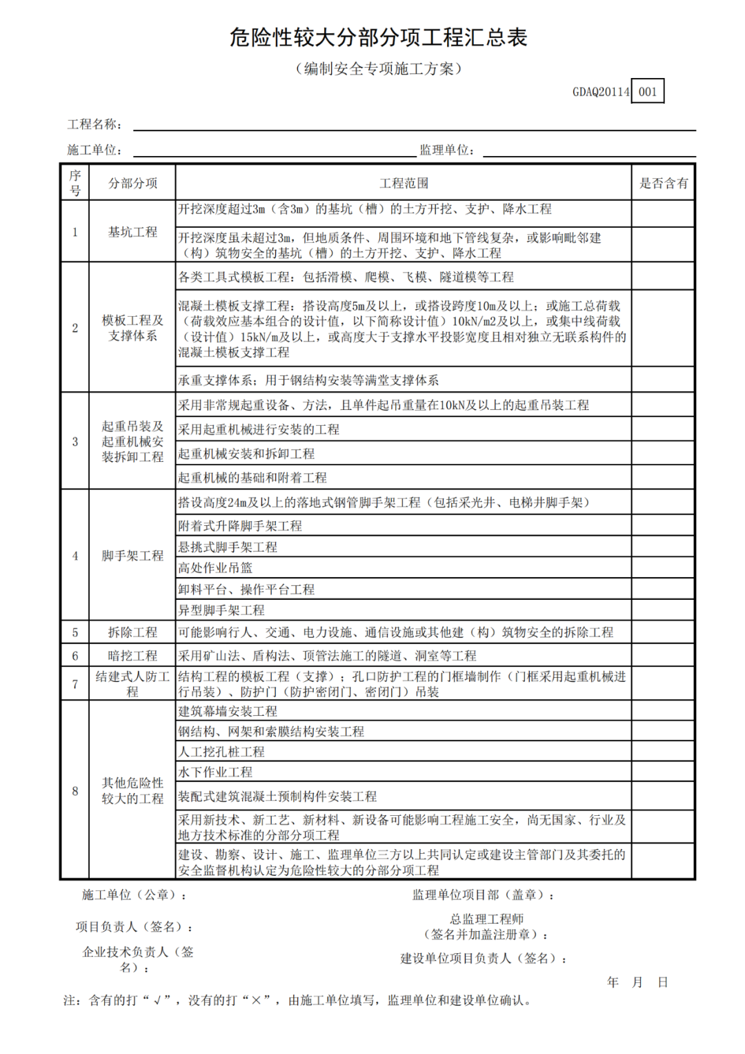 施工單位應在項目開工前建立本項目危險性較大分部分性工程清單,并根據施工現場實際動態完善危大工程清單。